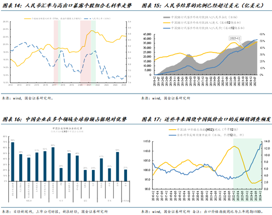 而在市场高度关注的人民币升值对出口出海链的影响上,从历史上看人民币趋势性升值期间,高海外暴露(海外业务收入占比超50%)个股组合的销售毛利率往往会经历先升后降的过程,整体幅度并不算大,且与2016年至2017年、2020年至2021年两轮升值周期相比,当下在出口结构、结算方式、贸易环境上都存在明显的不同,投资者可能无需过于高估人民币升值对出口出海企业竞争力的削弱幅度。一方面,随着人民币认可度的不断提升,当前出口的结算货币中,人民币结算的比例已经超过美元;另一方面,当前大量出口高景气的领域,中国集中了全球主要的产能与份额,具备一定的不可替代性,且产品附加值更高,价格传导能力更强;值得一提的是,近些年来围绕中国低价出口的贸易制裁事件频发,中国出口价格的适当回升可以部分缓和对华贸易保护主义的激烈反弹。