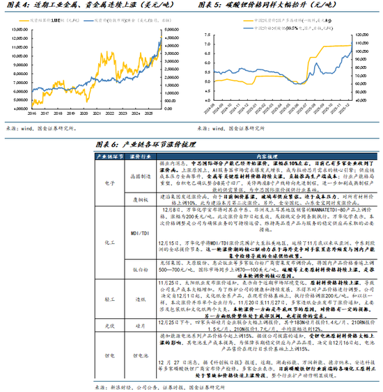 近期涨价链成为了市场关注焦点,并呈现出多领域扩散特征:大宗商品领域,贵金属、工业金属、碳酸锂等价格连创新高;科技链中,晶圆制造厂商中芯国际宣布对部分产能涨价10%,而覆铜板厂商建滔集团12月二次提价;反内卷板块中,化工(MDI、钛白粉)、造纸、硅片、锂电等领域同样宣布不同程度的涨价。从背后推动力上,通过梳理各家涨价函内容中可以看到,原材料价格的上涨成为主要因素之一,即成本推升的被动涨价居多;与此同时,反内卷政策的效果也正在显现,在面临上游涨价,下游压价的困境时,部分企业开始选择自发减产与联合提价的方式维护产业合理竞争秩序。
