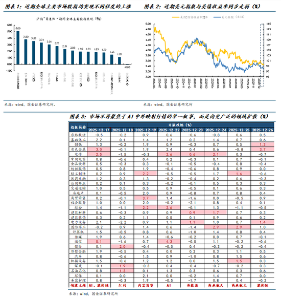 2025年12月中下旬以来,A股市场连续上涨,市场期待的跨年行情似乎正在启动。在国内外基本面尚未出现重大变化之际,当下反弹更像是前期分母端流动性紧缩预期边际缓和后的全球风险资产共振修复,全球主要市场股指均实现不同程度的上涨。值得一提的是行业层面,市场逐渐不再聚焦于AI中外映射行情的单一叙事,而是向更广泛的领域扩散,呈现出AI、内需、涨价链、新的产业主题(商业航天)轮涨的格局。